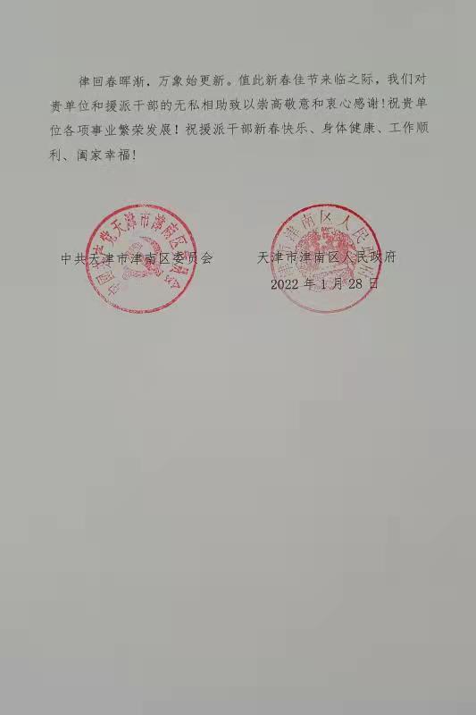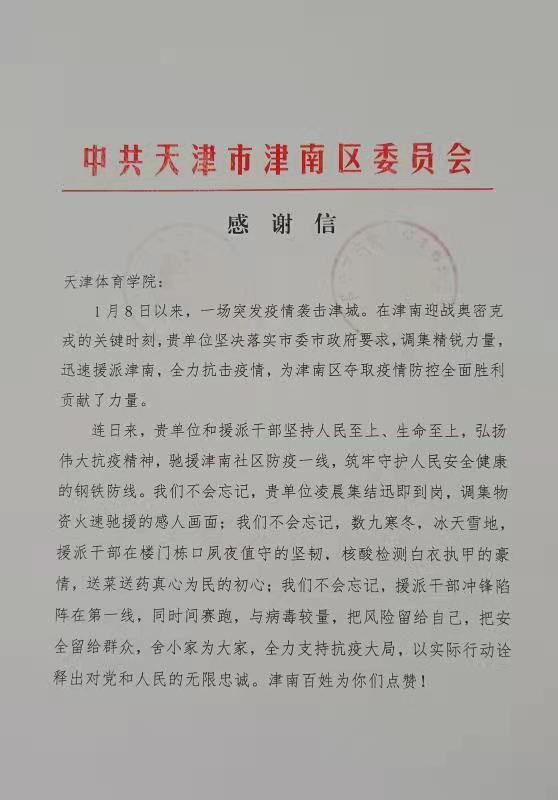 近日,中共天津市津南区委员会、天津市津南区人民政府向我校发来感谢信,对我校和援派干部坚决落实市委市政府要求,迅速驰援津南防疫一线,全力支持抗疫大局致以崇高敬意和衷心感谢。