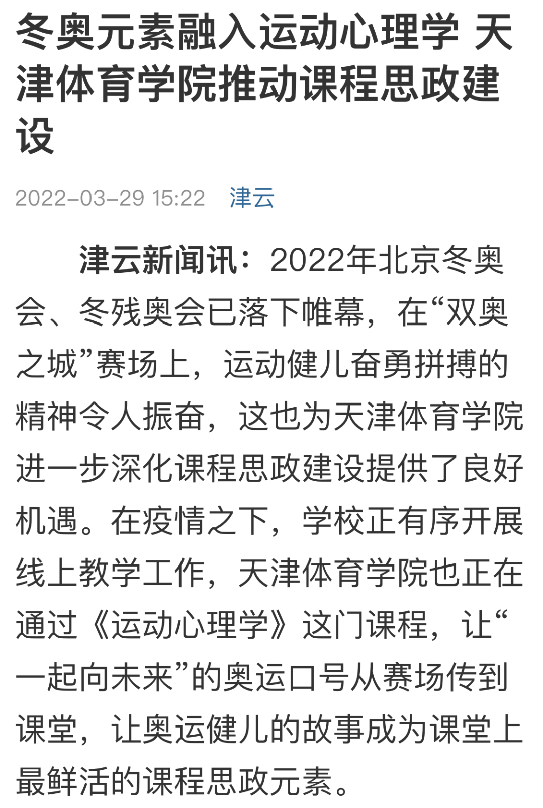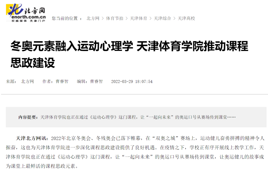 2022年3月29日,北方网、津云以“冬奥元素融入运动心理学 ld体育中国官方网站推动课程思政建设”为题,对我校进行报道,现全文转载。