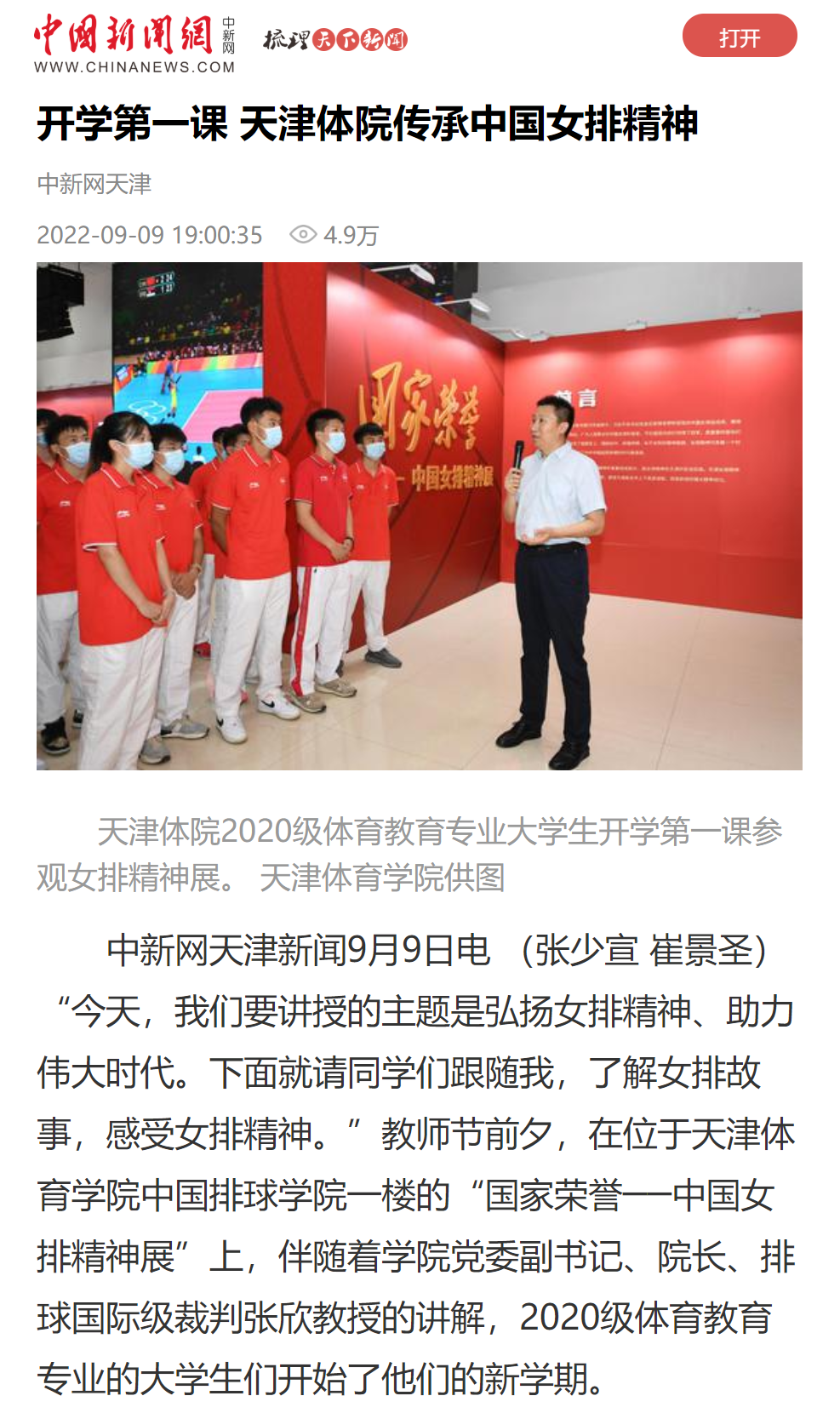 9月9日,教师节前夕,在位于ld体育中国官方网站中国排球学院一楼的“国家荣誉──中国女排精神展”,未来的体育教师、2020级体育教育专业的大学生们,聆听了不同寻常的开学第一课。中新网、津云等媒体对此进行了报道。