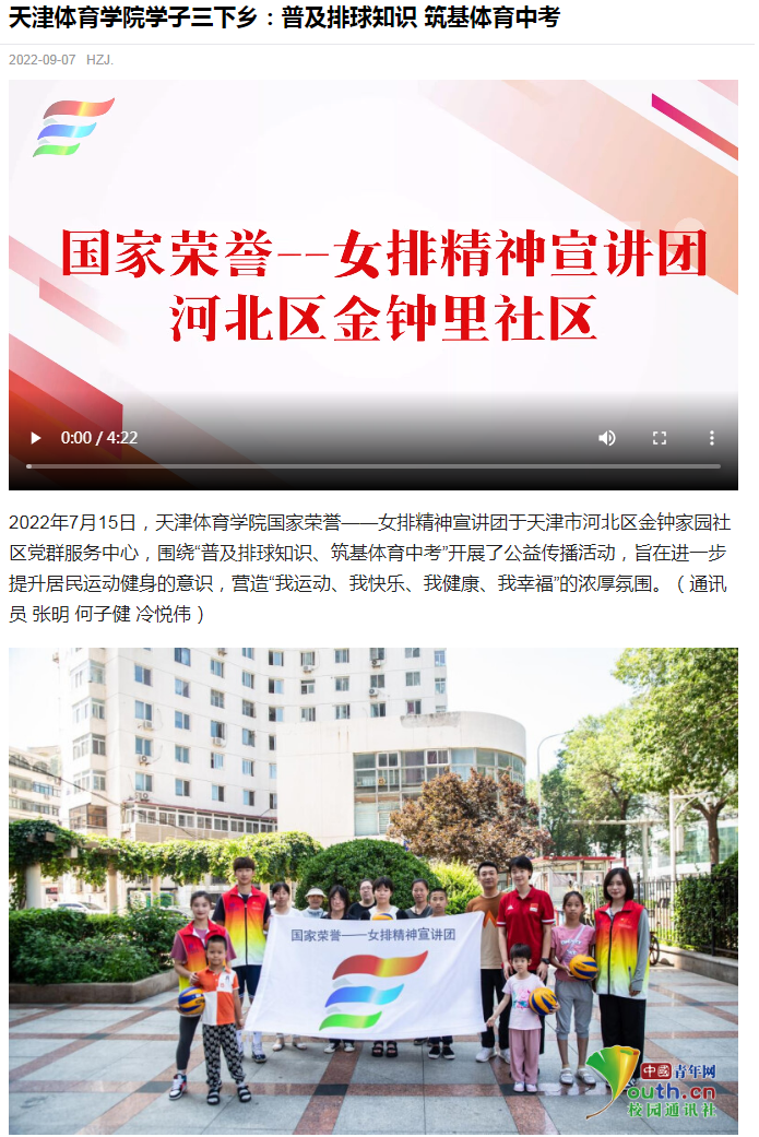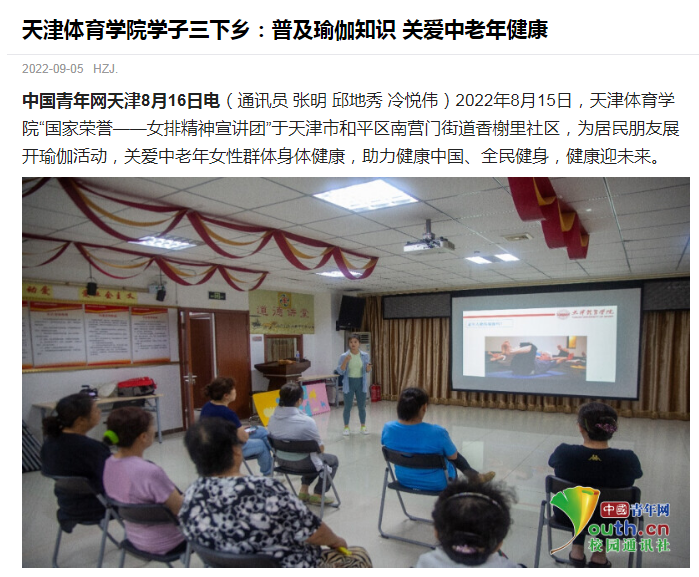 9月5日和7日,中国青年网分别以《ld体育中国官方网站学子三下乡:普及瑜伽知识 关爱中老年健康》《ld体育中国官方网站学子三下乡:普及排球知识 筑基体育中考》为题,持续关注报道我校学子开展“三下乡”社会实践活动。