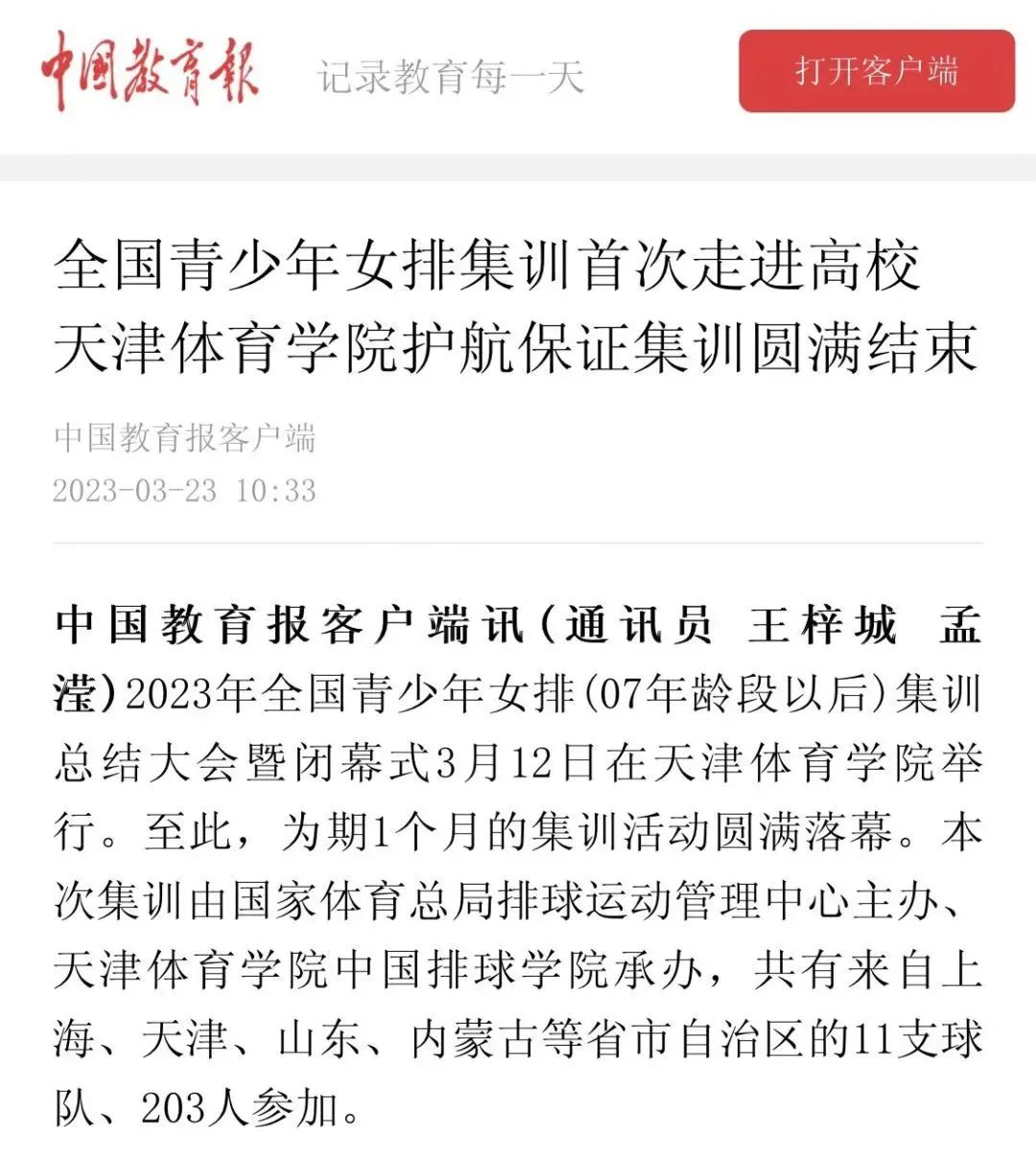 2023年全国青少年女排(07年龄段以后)集训于2月13日至3月12日在我校中国排球学院举行。这是排球运动管理中心成立以来第一次在高校举办的大集训。全国青少年女排集训期间,我校充分发挥多个学科、专业优势,为集训提供全方位保障。3月23日,中国教育报客户端以“全国青少年女排集训首次走进高校 ld体育中国官方网站护航保证集训圆满结束”为题,对此进行了报道。现全文转载。