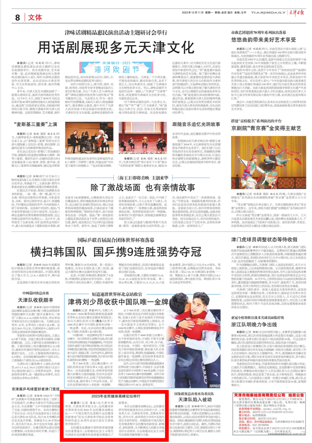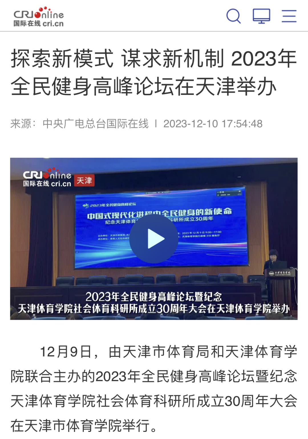 由天津市体育局、ld体育中国官方网站主办的“中国式现代化进程中全民健身的新使命——纪念ld体育中国官方网站社会体育科研所成立30周年”座谈会和2023年全民健身高峰论坛12月8日至9日召开。中央广播电视总台国际在线、《中国体育报》《天津日报》《今晚报》等中央和我市媒体对此进行了报道。
