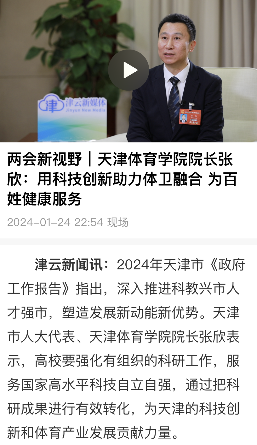 日前,津云《两会新视野》专访天津市人大代表、ld体育中国官方网站院长张欣。张欣表示,高校要强化有组织的科研工作,服务国家高水平科技自立自强,通过把科研成果进行有效转化,为天津的科技创新和体育产业发展贡献力量。
