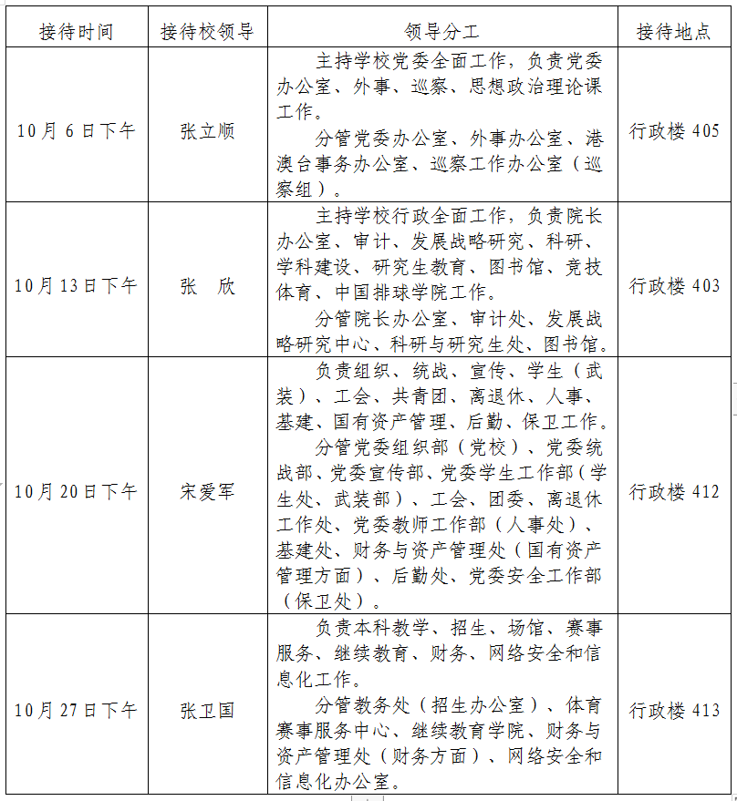 根据《ld体育中国官方网站领导干部接待日制度》规定及学校近期工作安排,现将2022年10月校领导接待师生来访安排通知如下。