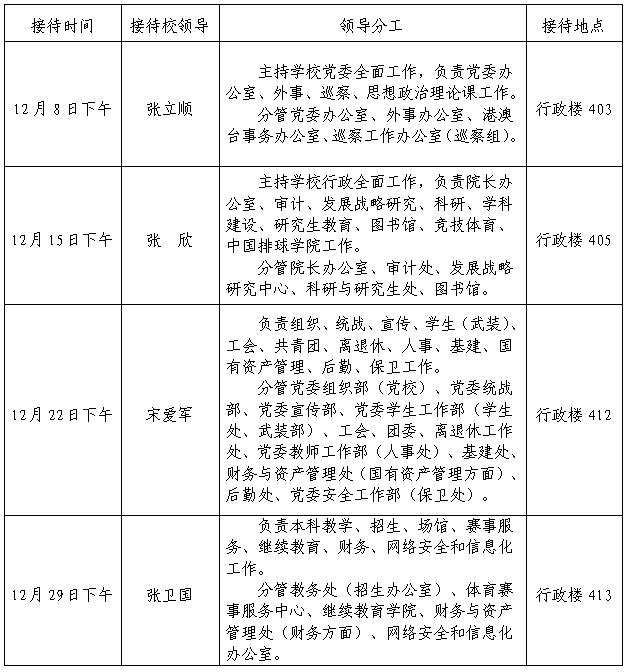 根据《ld体育中国官方网站领导干部接待日制度》规定及学校近期工作安排,现将2022年12月校领导接待师生来访安排通知如下。