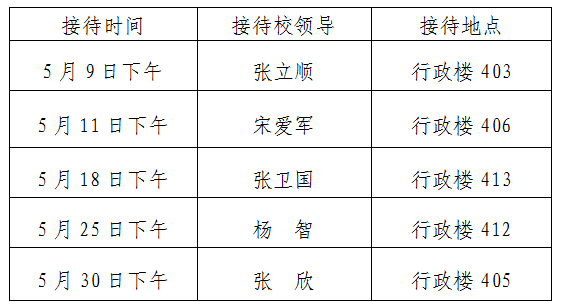 根据《ld体育中国官方网站领导干部接待日制度》规定及学校近期工作安排,现将2023年5月校领导接待师生来访安排通知如下: