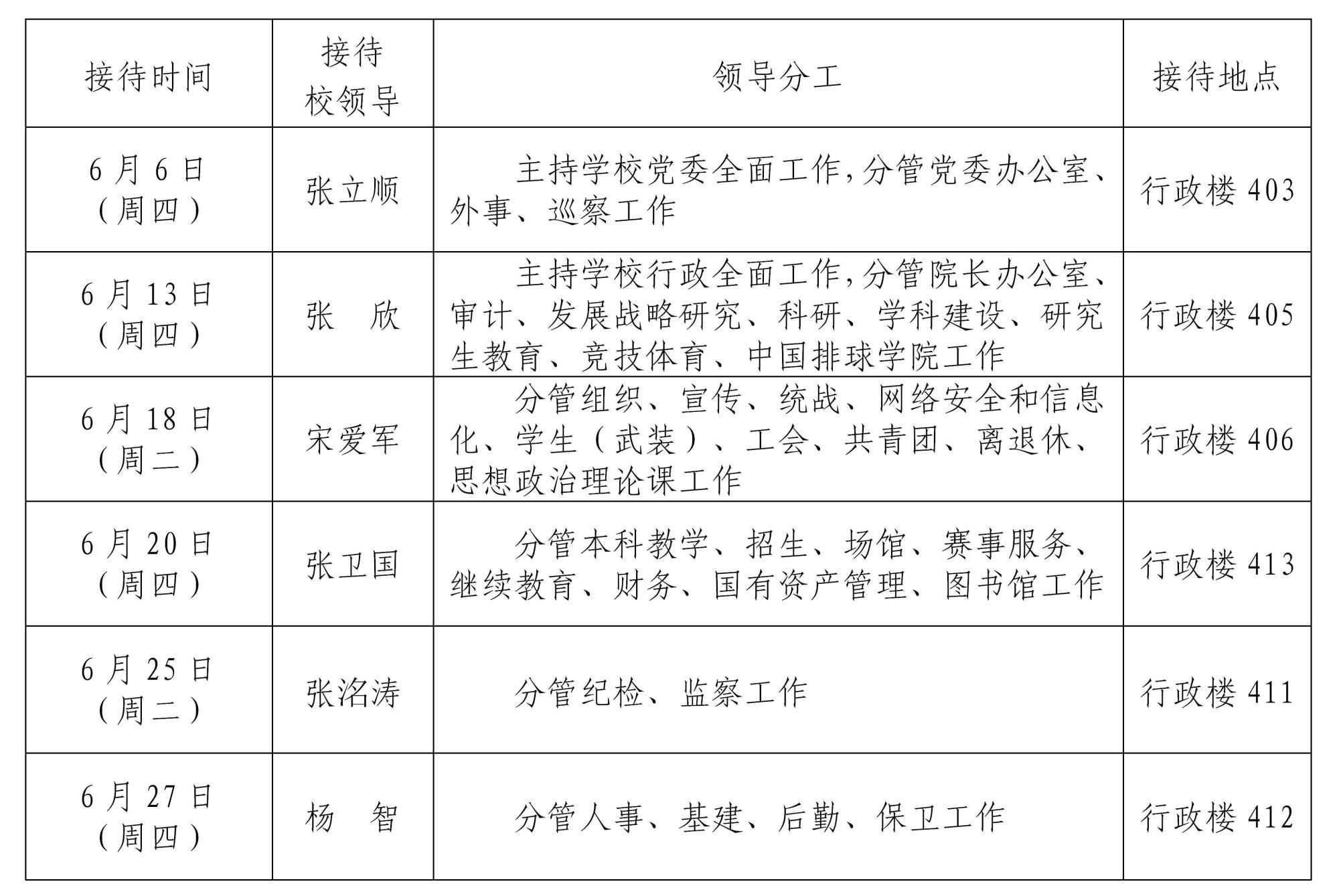 根据《ld体育中国官方网站领导干部接待日制度》规定及学校近期工作安排,现将2024年6月校领导接待师生来访安排通知如下: